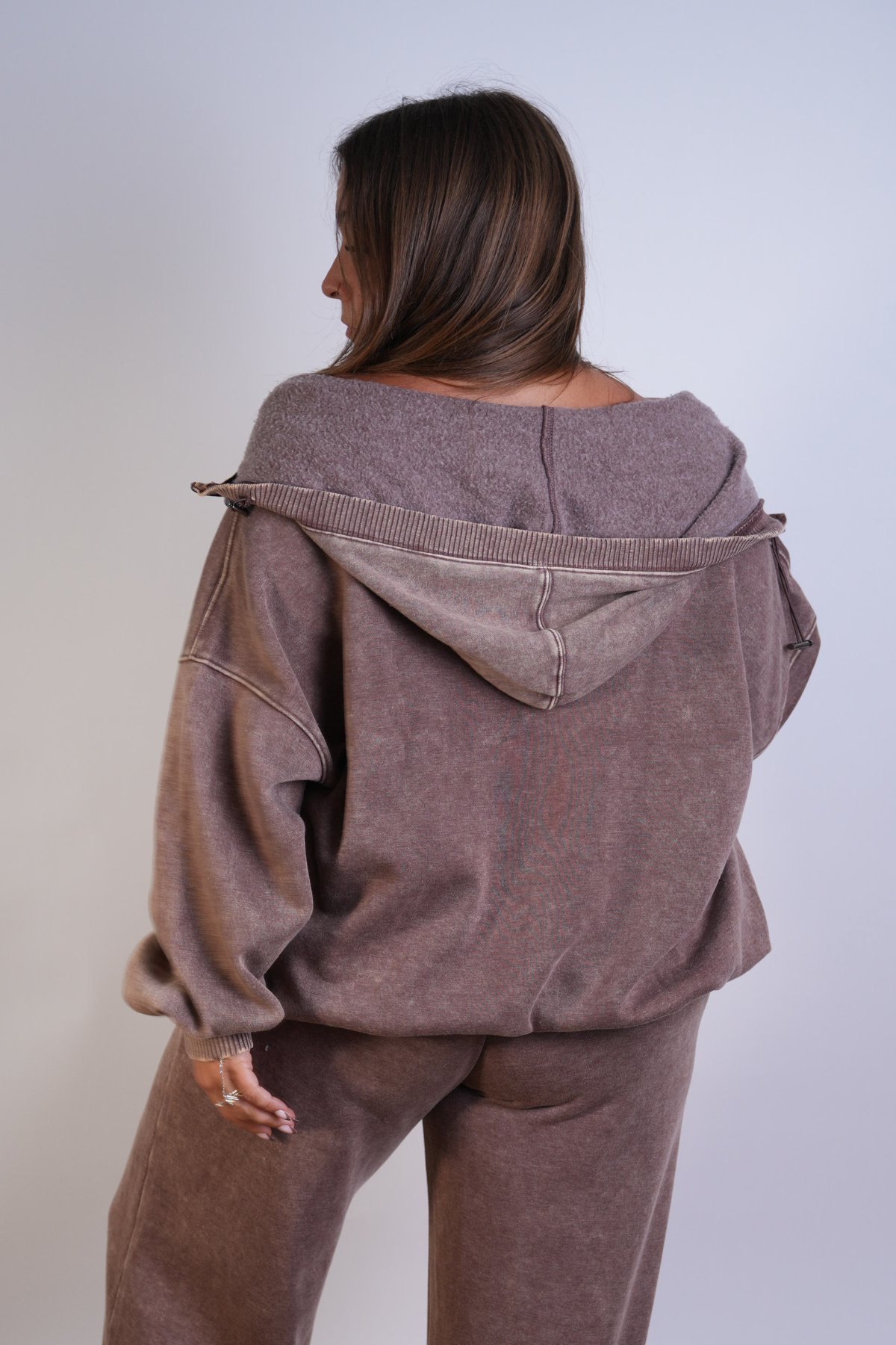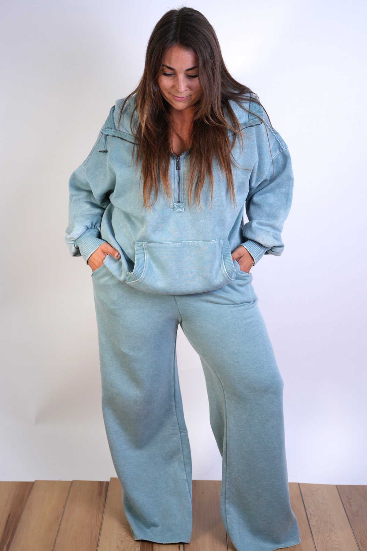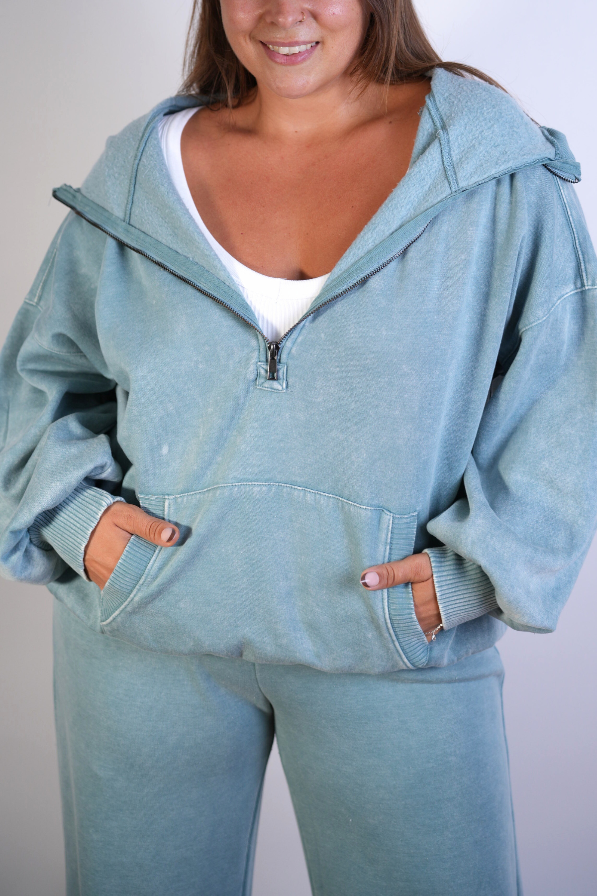 The Quarter Zip Hoodie is an easy, go-to layer you can quickly throw on. Combine it with our raw hem sweatpants for a simple, comfortable outfit perfect for travel or relaxing at home.